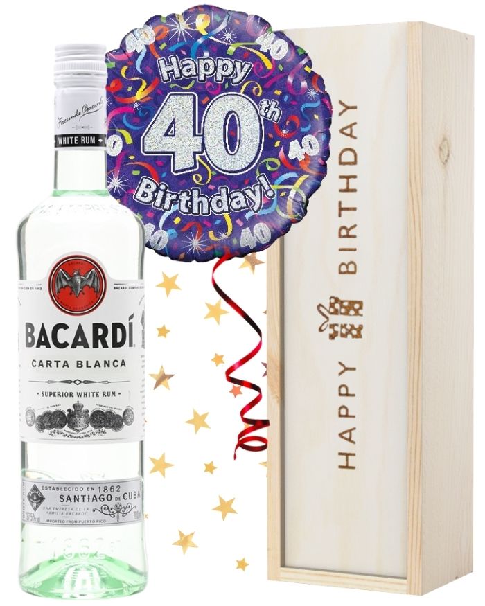 Make someone feel like they’re in the tropics for their 40th by sending them this delightful Rum gift set. Ideal for any Rum lover, let them celebrate with tropical cocktails using a single bottle of Bacardi Rum. It’s presented in one of our wooden ‘Happy Birthday’ gift boxes, making it not only delicious but elegantly styled. This gift also includes a fully inflated 40th birthday balloon to make this the best gift they’ll receive! This gift also includes a personalised and printed message, so you can let them know who to thank for sending the party. Have it delivered anywhere in the UK with next day or selected date delivery