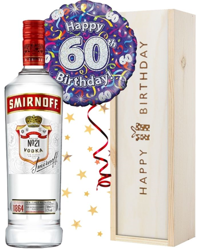 Every 60th birthday deserves a gift to get the party started, so why not send this delightful Vodka birthday gift? Perfect for celebratory cocktails, treat someone to a single bottle of Smirnoff Red Label Vodka to mark the occasion. It’s presented in one of our wooden gift boxes with ‘Happy Birthday’ printed on the lid. And what’s a birthday without a balloon? This gift also contains a fully inflated 60th birthday balloon, packaged to float out upon opening. Plus, add a personalised message to let them know it’s all from you. Have it delivered straight to their door with next day or selected date delivery anywhere in the UK.
