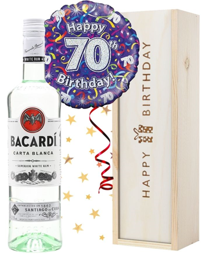 Send someone to the beach for their 70th birthday by gifting them this fun and tasteful Rum gift set. No matter how they’re celebrating, treat them to a single bottle of Bacardi Carta Blanca White Rum to enjoy on their special occasion. Together with a fully inflated 70th birthday helium balloon, the bottle is presented in one of our wooden gift boxes with ‘Happy Birthday’ printed on the lid. It’s the perfect gift for anyone who loves to party! With delivery anywhere in the UK, this gift can be sent either the next day or on a selected date straight to their door. Plus, you can complete this gift with a personalised message and turn their birthday into a beach party!