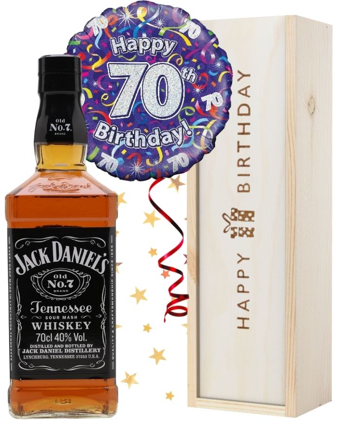 Perfect for any Whiskey lover turning 70, treat someone to this fantastic birthday gift. Whether for a friend, family member or colleague, send someone a single bottle of Jack Daniels Old No. 7 Tennessee Whiskey to enjoy on their special day. Plus, this gift also contains a fully inflated 70th birthday helium balloon to make it the best gift they’ll receive all year! The bottle is presented in one of our wooden ‘Happy Birthday’ gift boxes. You can perfect this gift with a personalised printed message to extend the birthday wishes. Delivery is available anywhere in the UK, either the next day or on a selected date.