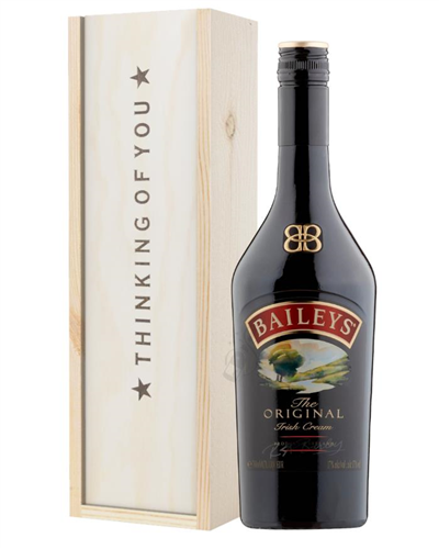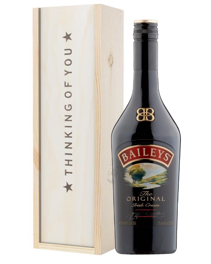 A truly magnificent gift set that allows you to send something special, to someone special, just because they’re on your mind. Complete with a single bottle of Baileys Original Irish Cream and delivered securely within a solid wood wool-lined wooden gift box, every inch of this perfectly crafted present option boasts unmatchable style and quality you simply won’t find anywhere else. Featuring the words Thinking of You branded on the sliding top and made to make a statement, no matter who you choose to send this amazing gift box to, you can rest assured they’ll enjoy each and every sip of deliciousness it provides. Easy to personalise with a message from you as well if you choose.