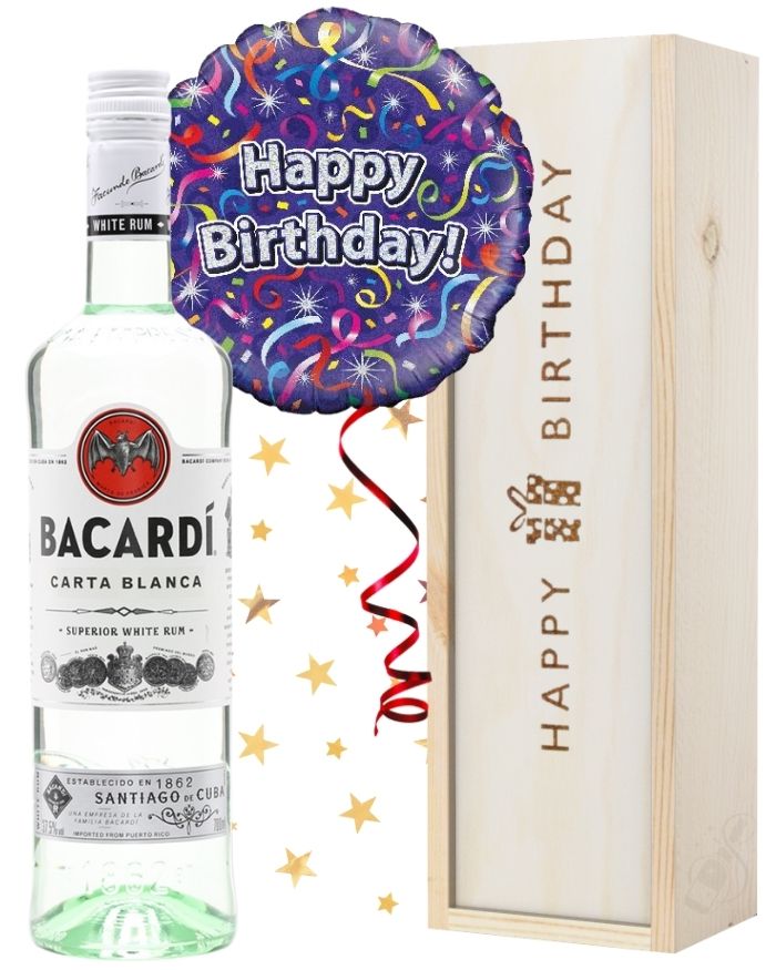 Help a Rum lover celebrate their birthday in the best way possible by sending them this exclusive Rum birthday gift set. Treat them to a single bottle of Bacardi Superior White Rum to enjoy in celebratory cocktails and add to their drinks selection. It’s presented and delivered in one of our ‘Happy Birthday’ wooden gift boxes. Plus, a birthday is not complete without a balloon, which is why we’ve included a fully-inflated helium ‘Happy Birthday’ balloon to pop out upon opening. This gift set can be sent anywhere in the UK and delivered the next day or on a day of your choice. You can also add a personalised message to be included with the gift.