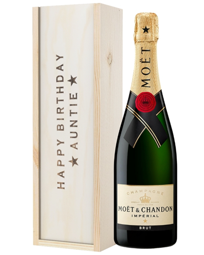 Complete your Aunt’s birthday with the pop of Champagne from this delightful gift. No matter how she’s celebrating, send her a single bottle of Moet & Chandon Imperial Brut Champagne to open and toast with friends and family. Perfectly presented, this gift includes a perosnalised message and is packaged in one of our wooden gift boxes with ‘Happy Birthday Auntie’ printed on the lid. What’s not to love and enjoy? You can have this gift delivered anywhere in the UK with next day or selected date delivery. So whether for an Aunt, Great-Aunt, Step-Aunt or Aunt-In-Law, make her smile on her special day with this exceptional gift.