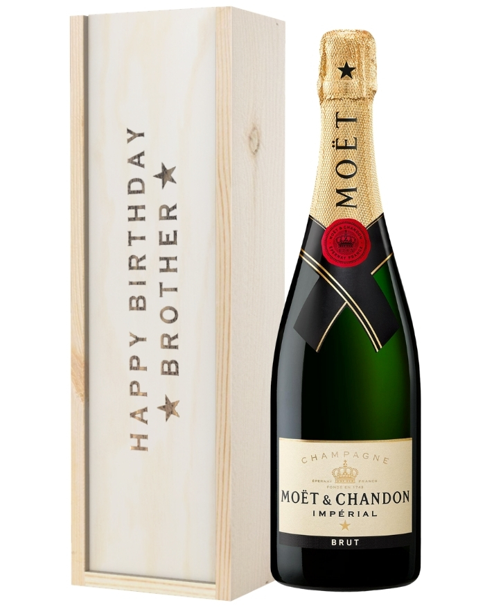 Give your Brother the birthday he deserves with this delicious Champagne gift set. No matter his age, let him pop open a single bottle of Moet & Chandon Imperial Brut to celebrate his special day. It’s elegantly presented in one of our wooden gift boxes with ‘Happy Birthday Brother’ printed on the lid and is protected with wood wool lining. Plus, add that personal touch with a written and printed gift message at no extra cost. You can send this gift anywhere in the UK with next day or selected date delivery. So no matter how far away you are, you can always send him the birthday gift he deserves.