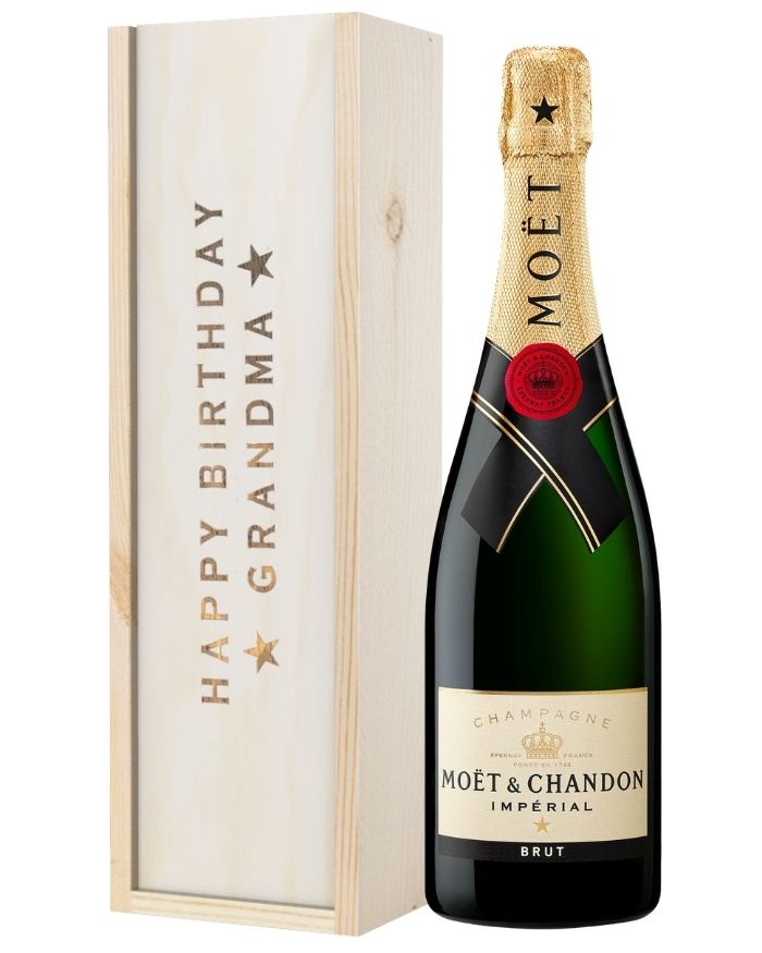 A simple yet sophisticated way to truly celebrate your grandma’s birthday this year. Fashionable in appearance and durable in form from top to bottom; this Champagne Birthday Gift Box for Grandma is designed to fully satisfy any grandma from the moment it arrives until every drop within it is gone. Easy to customise with a personal message from you within it if desired, this gift box comes complete with a single bottle of Moet & Chandon Imperial Brut Champagne and offers stunning and unmatchable flavours throughout every glass she gets to enjoy. This delightful gift set is delivered in a sturdy wooden gift box and features the words Happy Birthday Grandma stamped on top for all to see.