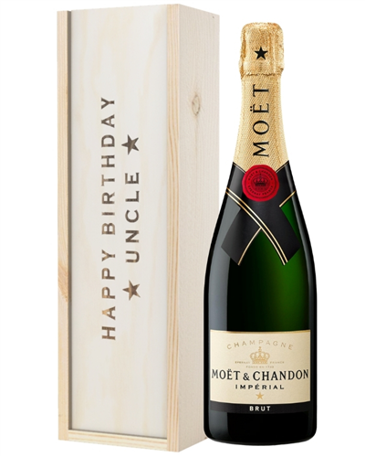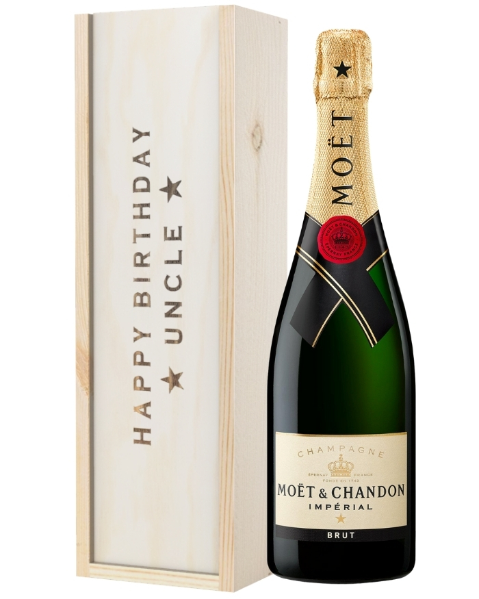 No birthday is complete without a bottle of Champagne to pop, so why not send one to your Uncle for his birthday? Send any Uncle, Great-Uncle, Uncle-In-Law or Step-Uncle a single bottle of Moet & Chandon to toast on their special day. Perfectly presented, this gift is packaged in one of our wooden gift boxes with ‘Happy Birthday Uncle’ printed on the lid and wood wool lining. You can complete this gift with a personal and heartfelt message to make him feel like the luckiest Uncle in the world. Have it delivered straight to his doorstep either the next day or on a selected date of your choice. What’s not to love?