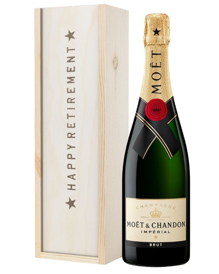 The ideal gift for celebrating such a momentous occasion; this elegant and classy gift set includes a single bottle of Moet & Chandon Imperial Brut Champagne and provides a one-of-a-kind way to share a drink to a long and truly illustrious career. Presented in a solid wooden gift box that comes lined with wood wool and branded with the words ‘Happy Retirement’ clearly on top, this gift set will make any recipient feel appreciated, accomplished and proud in a way that no other present option ever could. Simple to personalise with a message from you as well if desired, this Champagne Retirement Gift Box makes a statement at any retirement party or celebration it’s sent to.
