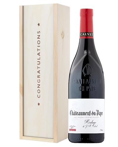 The ideal gift to send congratulations to any wine aficionado with something special to celebrate. Whether this remarkable box is delivered to a friend with a new baby or a co-worker that finally earned that long-awaited promotion, the recipient is certain to love every single taste from start to finish. Complete with a single bottle of truly chic Chateauneuf Du Pape and presented in a solid wooden box that is designed for secure delivery to nearly any location desired, this Chateauneuf Du Pape Red Wine Congratulations Gift Box is sure to stand out from any other present they receive. Personalise this gift set with a message from you and make sure they know exactly who this stunning present came from.