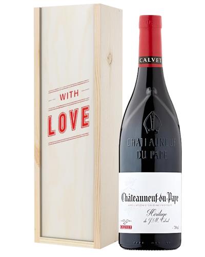 Make this Valentine’s Day feel like you’re in France with this beautiful gift set. A perfect accompaniment to any romantic meal, surprise your loved one with an indulgent single bottle of Chateauneuf Du Pape red wine. It’s beautifully presented in one of our wooden gift boxes with ‘With Love’ printed on the lid and is protected with wood wool for safe delivery. Complete this gift with a personalised message printed onto a stylish gift card. You can send this gift anywhere in the UK no matter the distance. So whether you’re together or apart this February, you can have this gift sent straight to your door with next day or selected date delivery.