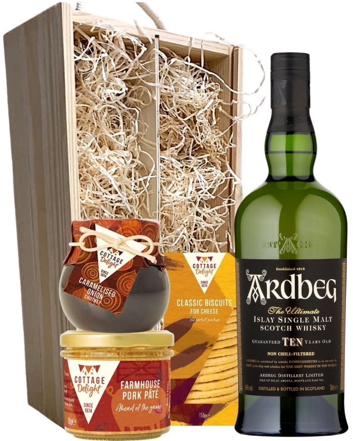Everyone knows Whisky and pate go perfectly together, so why not gift both with this delicious hamper? No matter the occasion, send someone a single bottle of Ardbeg Whisky alongside a 90g jar of Cottage Delight Farmhouse Pate with Pork, a 115g jar of pickles and a 150g package of Oval Alberts Savoury Biscuits. It’s the perfect picnic in a box! This hamper is presented in one of our wooden gift boxes and is protected with wood wool. Plus, complete this gift with a personalised message and have it delivered to any location in the UK with next day or selected date delivery. It’s the perfect gift for any Whisky lover.