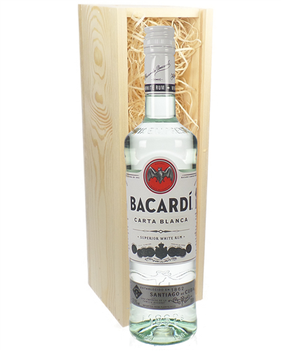 A unique yet versatile gift option you can feel confident sending, no matter the reason. Surprise your spouse with something special or send thanks to a brand-new client; no matter why you choose to send this Bacardi Rum Gift Box, you can rest assured that anyone receiving it will be truly thankful to enjoy such an amazing gift from top to bottom. Delivered in a solid wooden gift box lined with wood wool and ideal for any occasion any time of the year, this chic and elegant gift set comes with a single bottle of Bacardi Carta Blanca Rum. It can also include a personal message from you along with it if desired.