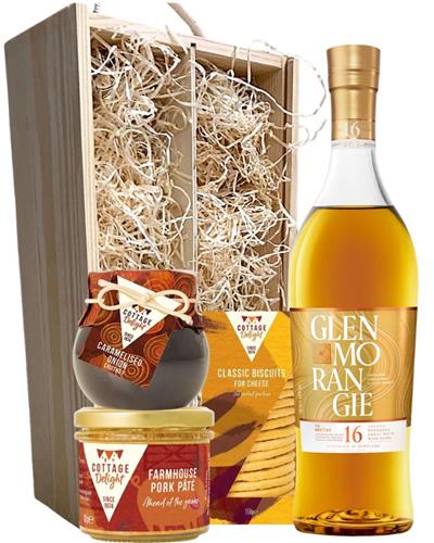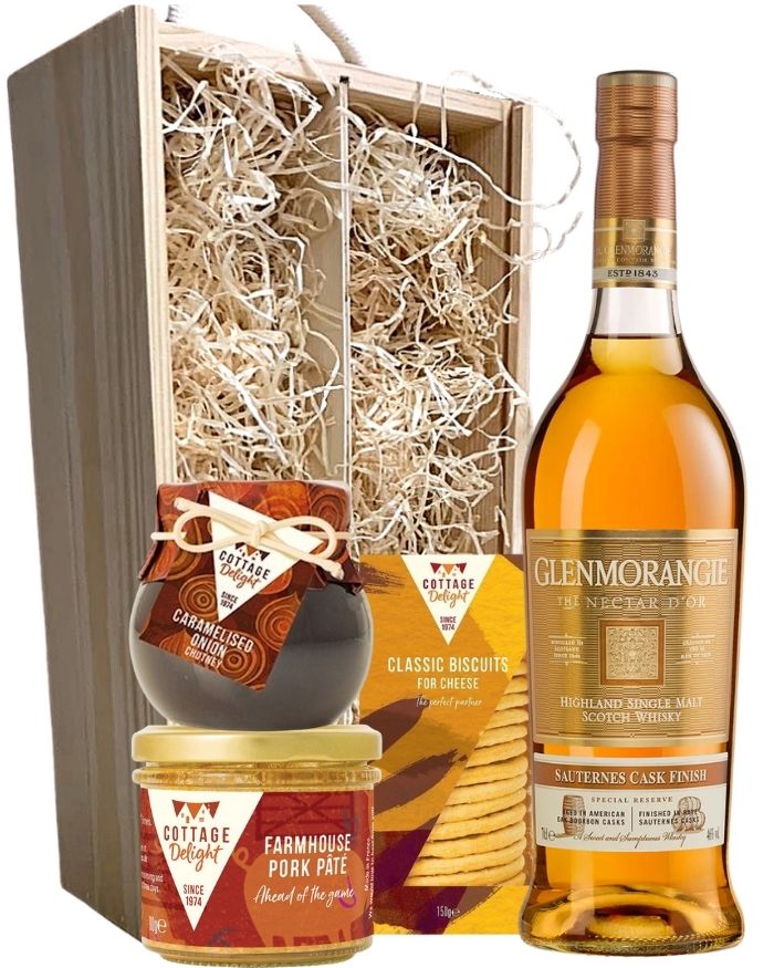 Housed within a solid wooden gift box and certain to offer an unmatchable combination of flavours from start to finish; this remarkably chic and high-quality gift set includes a single bottle of Glenmorangie Nectar D’or Highland Single Malt Scotch Whiskey, a 90g jar of Cottage Delight Farmhouse Pate with Pork, a 115g jar of pickles, as well as a 150g package of Oval Alberts Savoury Biscuits. A great gift for surprising your best friend for their birthday or a co-worker on their recent promotion. Easy to personalize with a message from you as well if desired.