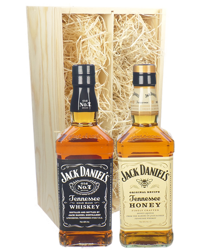 This gift spells double trouble. Treat a Whiskey lover to not one, but two bottles of the famous Jack Daniels Whiskey. Complete with two of the most popular flavours, this sent contains a single bottle of the best selling Old Number 7 and a single bottle of Jack Daniels Honey. Both perfect for neat, on the rocks or with mixers, this duo is perfect for any Jack Daniels fan with an occasion to celebrate. Presented in on of our wooden twin gift boxes, this set can be delivered the next day or on a date of your choice. Don’t forget to add a personalised message to be included with the gift, so they know how to thank!