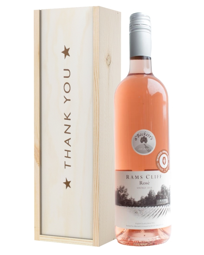 Give a deliciously fruity thank you with this delightful English rose gift. No matter what you’re saying thank you for, show your appreciation with a single bottle of Rams Cliff Rose. Located in the heart of Wiltshire, this gorgeous rose is produced from a’Beckett’s Vineyard using a blend of Pinot Noir and Reichenstainer to create an exquisite taste. Including a personalised message, it’s presented in one of our wooden gift boxes with ‘Thank You’ printed on the lid. Plus, get it delivered anywhere in the UK, either the next day or on a date of your choice. It’s the perfect thank you gift for anyone who loves wine.