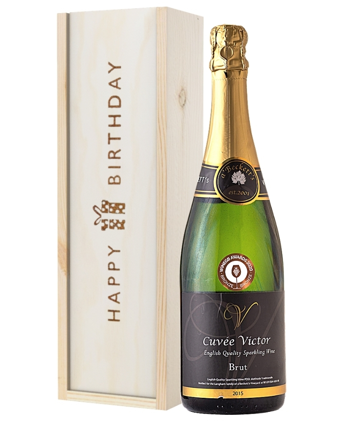 Celebrate a birthday in full British style with this English sparkling wine gift. Send a single bottle of Cuvee Victor Brut straight to their door for them to pop open and toast. Produced by a’Beckett’s vineyard in Wiltshire, it’s packaged and presented in one of our wooden gift boxes with ‘Happy Birthday’ printed on the lid. Plus, get it delivered as soon as the next day or select a delivery date most suitable for you. No matter who it’s for or where they are, don’t forget to add a personal message to the gift, so they know who it’s from! So make someone’s birthday special and surprise them with this beautiful gift.