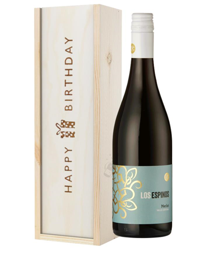 Offering a magnificent Merlot wine that tastes as great as it looks, this amazing gift box features absolute style and sophistication that no other gift option can match. Complete with a single bottle of Merlot produced from Los Espinos vineyards based in the Central Valley of Chile, this chic bottle of wine comes presented in a sturdy wooden box with the words ‘Happy Birthday’ printed clearly on the top. Just the birthday gift anyone would love to receive; whether you choose to send this Merlot Red Wine Birthday Gift Box to your wife, husband, mother, father, cousin or even just a friend, any recipient will truly appreciate every sip of the contents it provides.