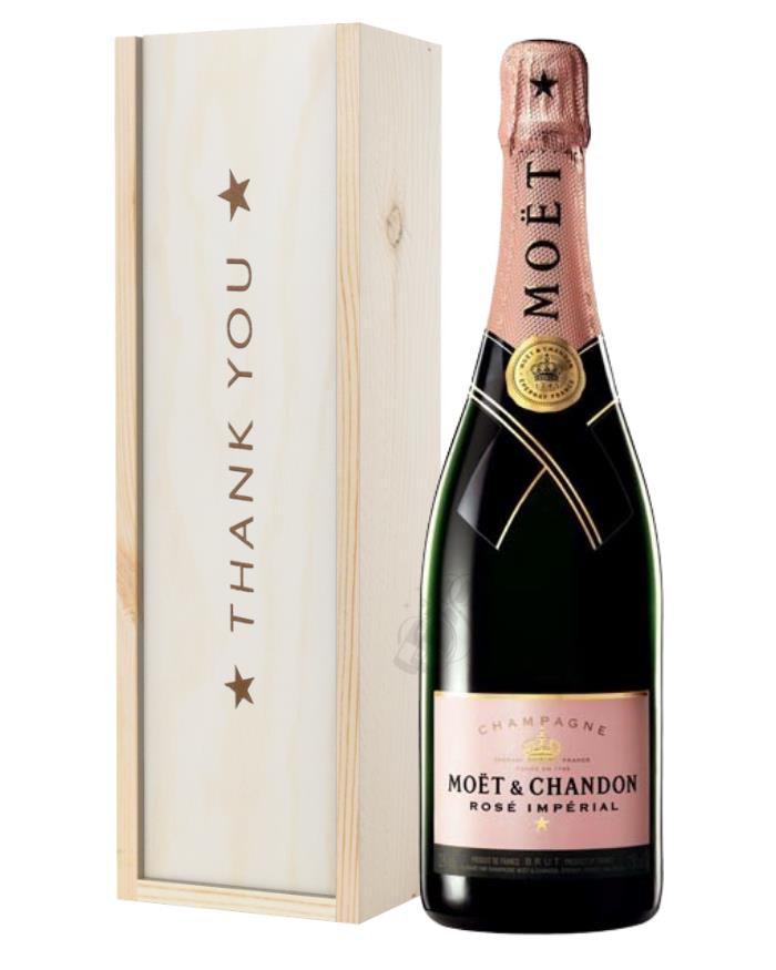 Say thank you in the most beautiful way by sending someone this gorgeous Champagne gift. Nothing shows gratitude more than a surprise gift, so why not surprise someone with a single bottle of Moet & Chandon Rose Imperial at their door? Whether they babysat your children, did you a favour or are simply a fantastic friend, give them this gift to show your appreciation. It’s presented in one of our wooden gift boxes with ‘Thank You’ printed on the lid and wood wool lining for protection and style. Next day or selected date delivery is available, and don’t forget to add a personalised message to make this the best gift they receive all year!