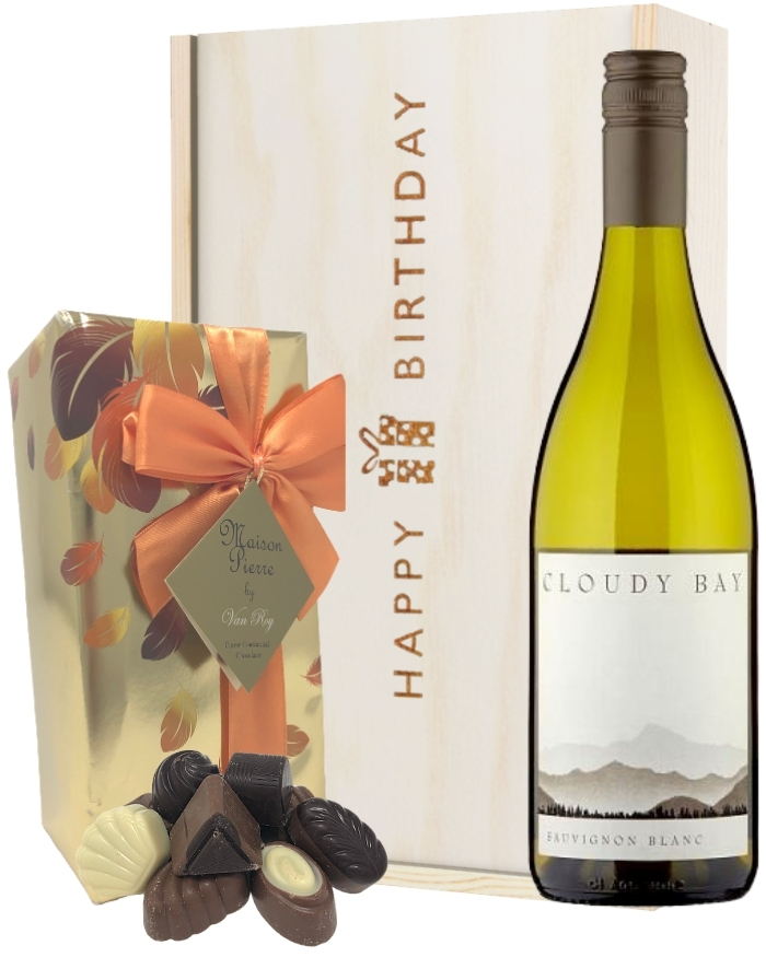 A single bottle of Cloudy Bay Sauvignon Blanc 2015 wine together with assorted Belgian chocolates (250g approx 20 chocolates). Presented in a Happy Birthday design wooden gift box lined with woodwool. Personalise this gift by adding your own personal message.