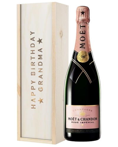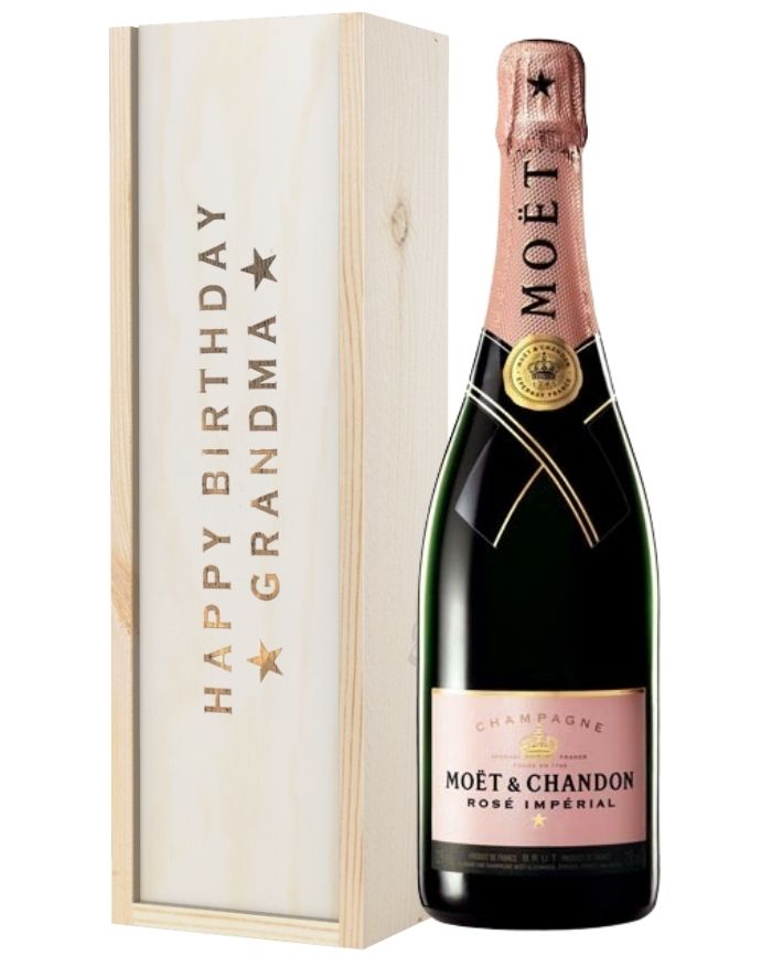 Perfectly pink and truly tasty from the inside out; this Pink Champagne Birthday Gift Box for Grandma is made to provide extraordinary style and fabulous flavour that you simply won’t get from any other gift set on the market. Complete with a single bottle of Moet & Chandon Rose Imperial Champagne and easy to personalise with a message from you as well, from the moment this high-quality gift box arrives she’ll be more than ready to slide open the lid, pop the top, and enjoy every sip until the bottle is gone. Delivered in a solid wooden gift box lined with wood wool throughout the inside, this gift box also features the words Happy Birthday Grandma beautifully printed on top.