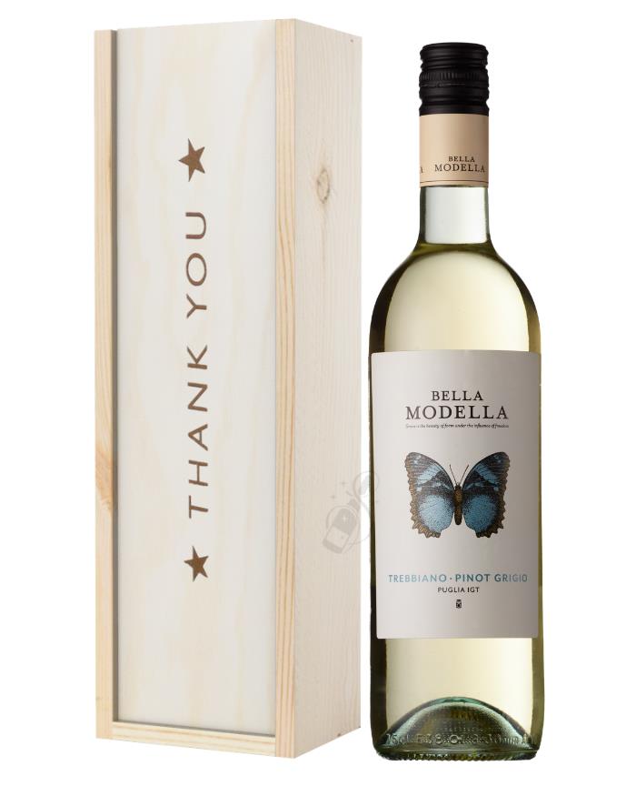 A unique and elegant way to say ‘Thank You’ to anyone in your life from a friend or family member to a co-worker or client. This Pinot Grigio White Wine Thank You Gift Box provides true class and sophistication in a way that no other present ever could. Complete with a bottle of Northern Italian Pinot Grigio White Wine from Bella Modella and delivered in a solid wooden box lined with wood wool and with the words ‘Thank You’ stamped on top; this amazing gift set can also include a personal message from you as well as a compatible thank you balloon along with it as well if chosen as an option upon purchase.