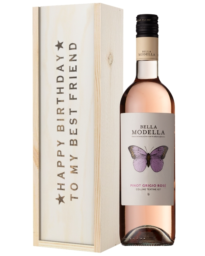 Let your best friend celebrate their birthday with a delicious glass of Rose wine on your behalf. No matter where they are, treat your best friend to a single bottle of the delightful Bella Modella Pinot Grigio Rose Wine. It’s packaged and presented in one of our classic wooden gift boxes with ‘Happy Birthday To My Best Friend’ printed on the lid. It’s also protected with wood wool and includes a personalised message to add that extra touch. Have it delivered anywhere in the UK either the next day or on a date of your choice. It’s the perfect gift for any best friend that loves wine, so why not send this magnificent gift to them this year?