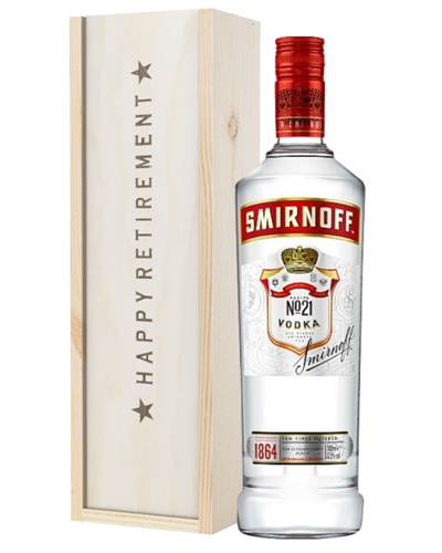 Offering smooth and classic flavour that assures this gift box stands out from every other present they receive; this high-quality gift box is the perfect way for anyone to celebrate their retirement. Delivered in a sturdy wooden gift box lined with wood wool and branded with the words ‘Happy Retirement’ on top, this gift set can also be personalised with a message from you to be included along with it if desired. Complete with a single bottle of Smirnoff Triple Distilled Vodka and ideal for any vodka-lover to sip and savor, this truly sophisticated Vodka Retirement Gift Box is great for celebrating a long-awaited retirement from an impressive career.