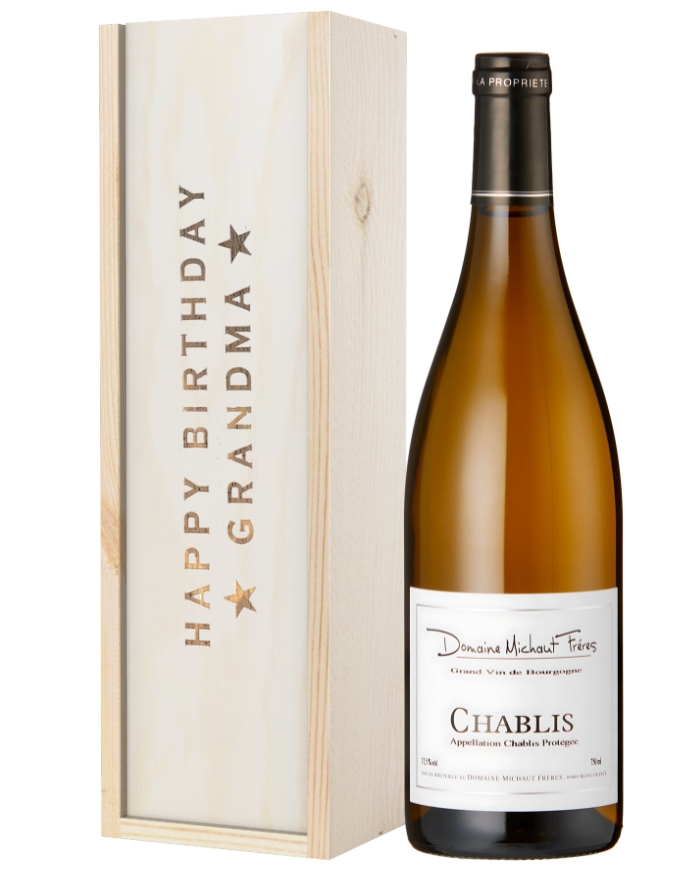 Presented in a durable wooden gift box and featuring the words Happy Birthday Grandma beautifully branded on top, this unique and stylish gift set is certain to satisfy any white wine-loving grandma in your life you choose to send it to. Easy to personalise with a message from you as well if desired, this White Wine Birthday Gift Box for Grandma is created to make a statement at any birthday celebration, any day of the year. Complete with a single bottle of Chablis White Wine and offering unmatchable flavour from start to finish, from top to bottom this magnificent gift box boasts a bold and sophisticated design that no other present option on the market can match.